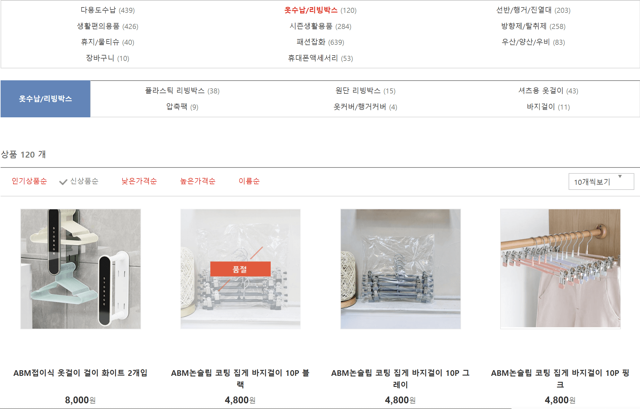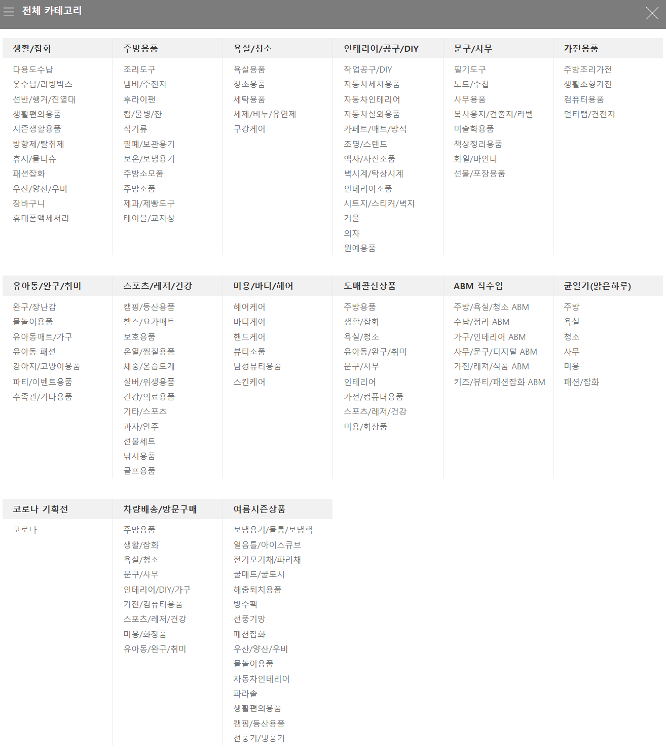- 3층: 욕실용품, 생활가전, 원예, 청소용품 등
