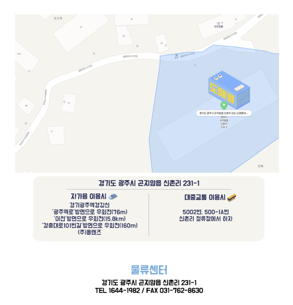 곤지암 도매콜은 곤지암IC 인근에 위치해 광주뿐 아니라 이천, 용인, 성남 등 인근 지역에서도 접근성이 뛰어납니다.