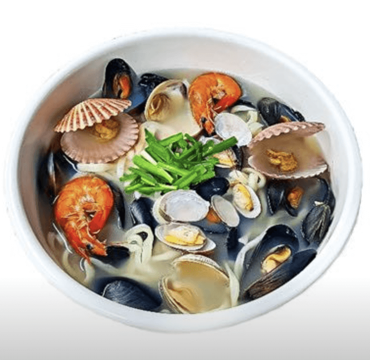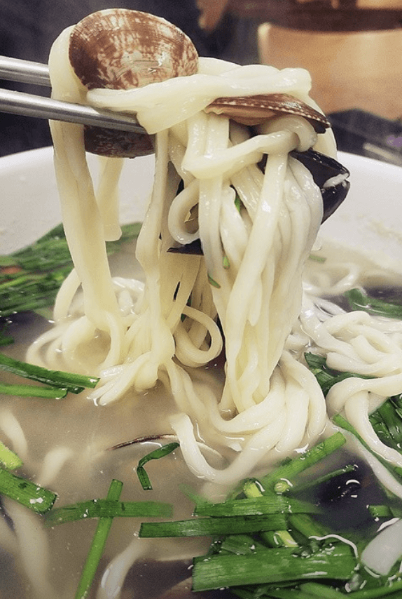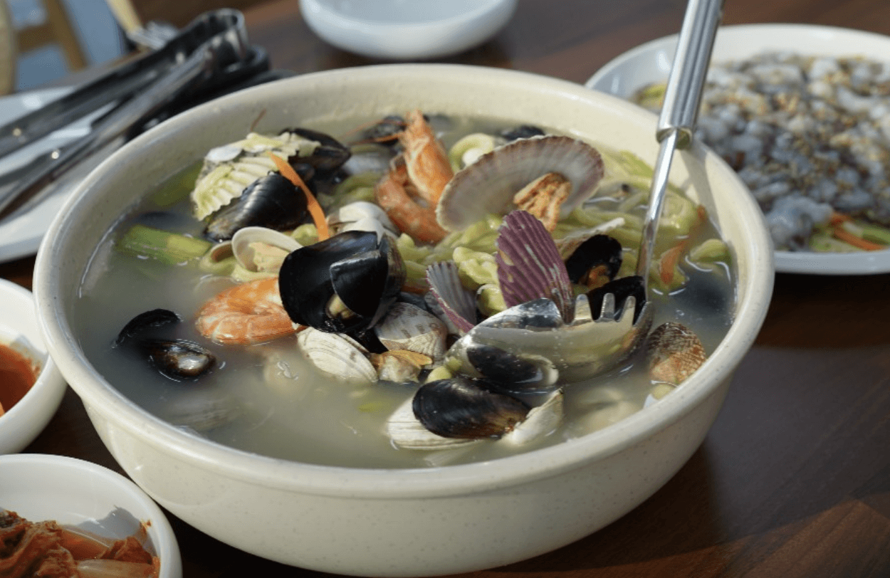 3. 부추해물칼국수: 조개, 홍합, 가리비, 새우 등 해물 풍부 (12,000원), 시원한 국물, 쫄깃한 면발