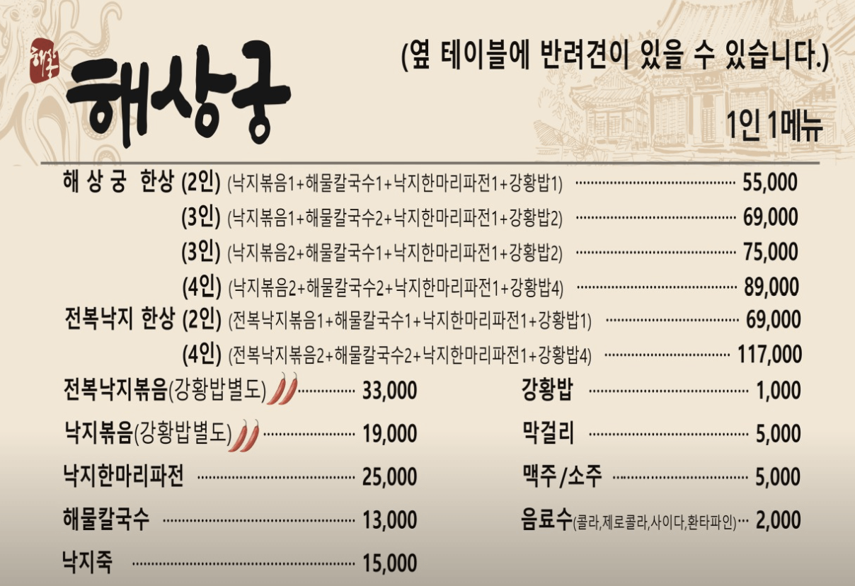 ※ 세트 메뉴(해상궁 한상)는 낙지볶음, 낙지파전, 해물칼국수, 강황밥이 한 번에 제공돼 여러 메뉴를 한 번에 즐기고 싶은 분께 인기입니다.