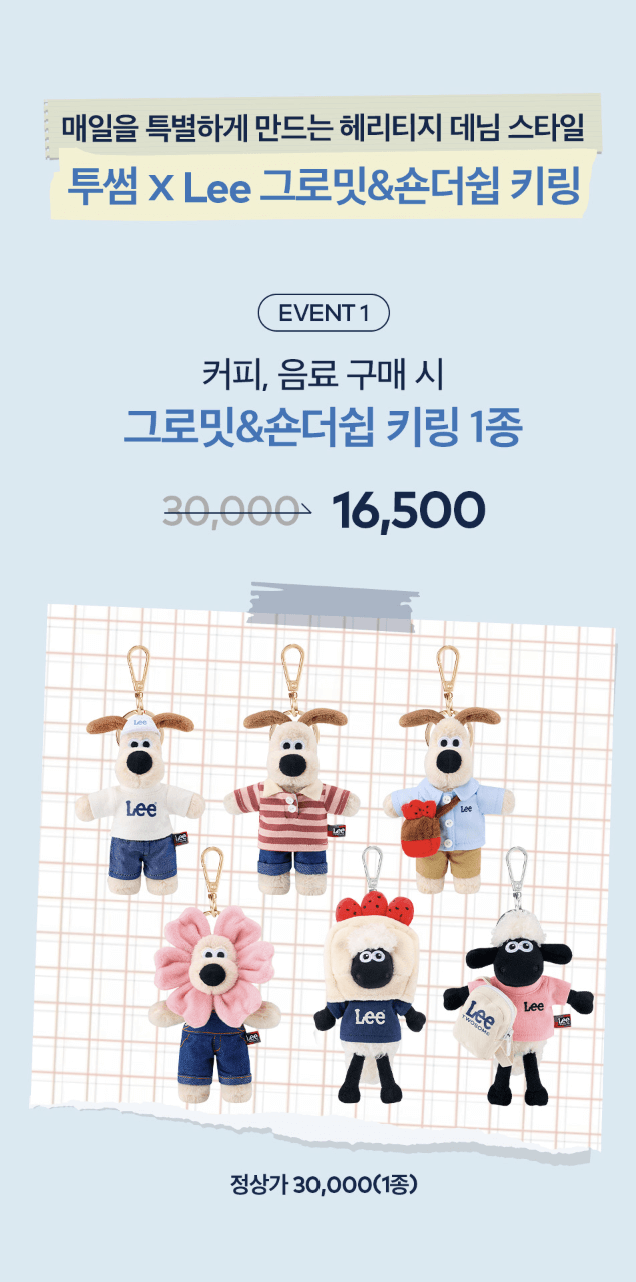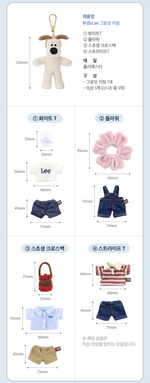 - 다양한 디자인: 투썸플레이스 그로밋 키링은 총 6종(티셔츠, 플라워, 스초생, 스트라이프, Lee 반팔, 볼캡)으로, 각기 다른 의상과 포즈로 소장 욕구를 자극합니다.