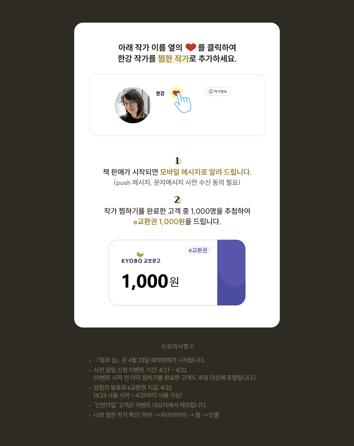 - 4월 23일부터 교보문고, 알라딘, 예스24 등에서 예약 판매가 시작됩니다. 교보문고에서는 ‘출간 알림 신청 이벤트’도 진행 중이며, 알림 신청자 중 추첨을 통해 e교환권 등 다양한 혜택이 제공됩니다.